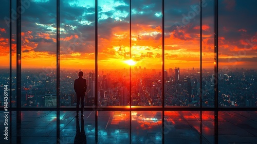 sunset, city, business, modern, view, window, sky, urban, silhouette, outlook, future, success, inspiration, motivation, aspiration, leadership, career, opportunity, growth, entrepreneur, achievement, perspective, dream, horizon, daylight, dramatic, colourful, light, colours, skyscraper, highrise, building, office, panoramic, viewpoint, exterior, image, photo, beautiful, amazing, investment, financial, visionary, businessman, standing
