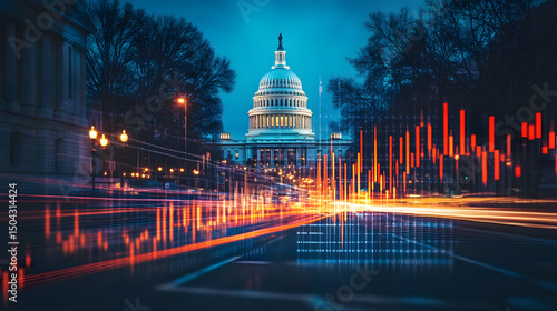 US Capitol Building with market index chart overlay and motion light streaks at night