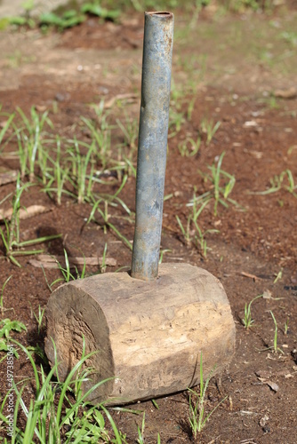Used hammer made of wood lying on the grass, Antique wooden hammer.
