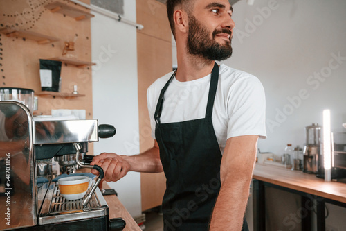 Using coffee machine. Cafe worker in white shirt and black apron is indoors