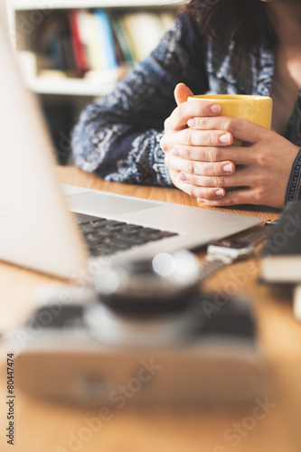 cup, girl, hipster, tea, hot drink, laptop, lifestyle, modern, office, business, woman, yellow, adult, beautiful, brunette, businesswoman, casual attire, computer, curly, cute, female, hair, home, house, cyberspace, people, person, room, sitting, student, technology, using, white, working, young