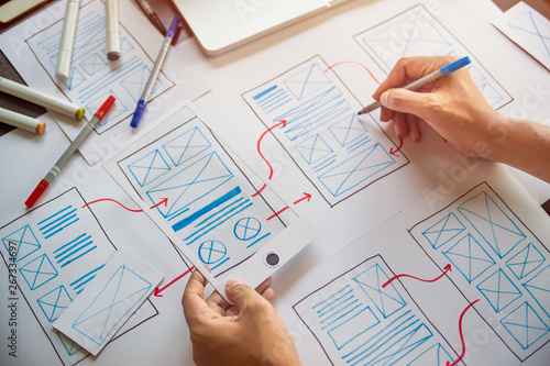 ux Graphic designer creative sketch planning application process development prototype wireframe for web mobile phone . User experience concept.