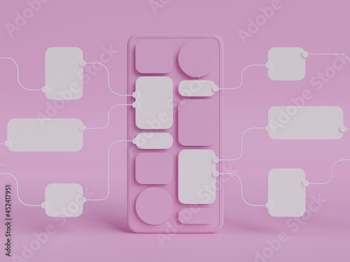 UX UI flowchart connection node graphic designer creative planning application process development data prototype wireframe for web mobile icon phone . User experience concept. 3d rendering.