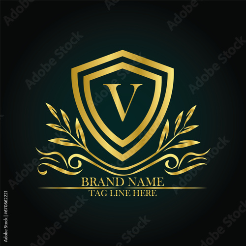 V luxury letter logo template in gold color. Elegant gold shield icon. Premium brand identity emblem. Royal coat of arms company label symbol. Modern vector Royal premium logo template vector