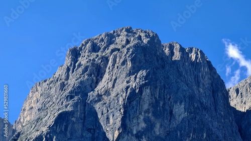 Val Badia, Italy-July 18, 2022: The italian Dolomites behind the small village of Corvara in summer days with beaitiful blue sky in the background. Green nature in the middle of the rocks.