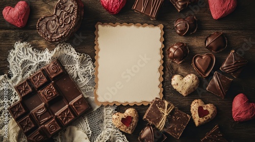 Valentine mockup card and heart background minimal. Sweet Indulgence Chocolate Hearts and Candies Composition with Empty Frame Valentines Day Treat Display.