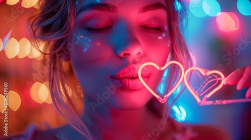 Valentine`s day Beauty girl on disco party in neon light blowing Valentine neon hearts