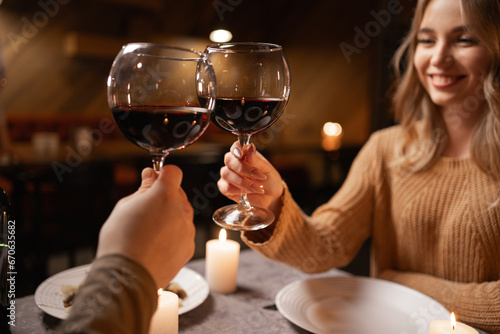 Valentine's Day concept. Happy young couple in love clinking glasses drinking wine, romantic dinner, celebrating Valentines Day sitting at table at home.