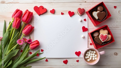 valentine, day, postcard, aerial, view, nubes, shaped, cookie, chocolate, red, gift, box, tulip, rose, flower, hot, cocoa, hot drink, wooden, background, copy, space, blank, white, card, festive, atmosphere, celebration, love, treat, romantic, greeting, message, design, template, illustration, top, photo, image, hot chocolate, marshmallow