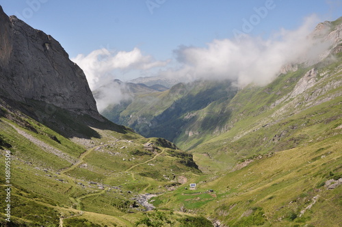 mountain, pyrenées, landscape, heaven, nature, cloud, vale, green, rock, blue, grass, peak, travel, forest, view, summer, snow, hill, panorama
