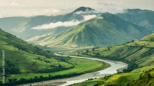 Valley Serenity: A scenic valley unfolds, with a winding river carving its path through rolling green hills, offering a vista of tranquility and natural beauty.