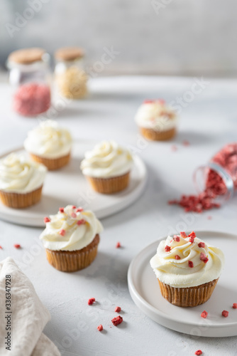 Vanilla cupcakes decorated with white frosting and dried strawberry on gray table. Side view, close up. Cookbook recipe, menu, bakery, pastry concept