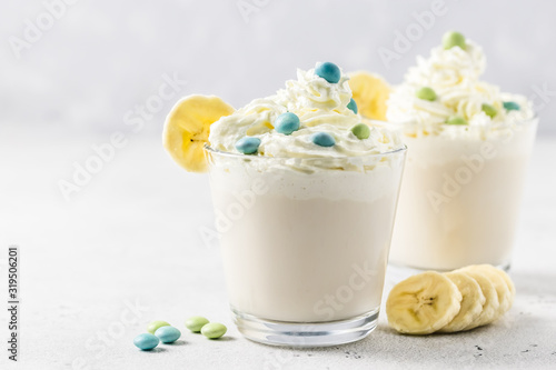 Vanilla whipped cream banana milk shake. Selective focus, copy space.