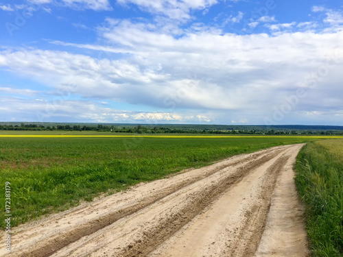 road, dirt road, path, way, nature, plain, landscape, view, scenery, scenic, panorama, panoramic, horizon, perspective, vanishing, environment, tree, bush, shrub, grove, grass, growth, brown, green, blue, sky, summer, meadow, ground, land, earth, russia, sunny, bright, wood, twisting, winding, meandering, clay, rural, village, track, dry, tall, cloud, farm, field, wheat, harvest