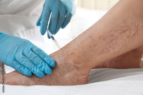 Varicose veins treatment. Doctor giving injection to patient indoors, closeup