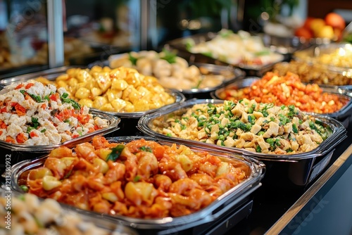 Varied buffet dishes in metal trays, close-up. Perfect for illustrating catering, restaurants, or food blogs, shows delicious variety.