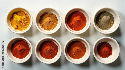 food ingredient, cooking ingredient, seasoning, condiment, flavouring, spice, herb, yellow, orange, red, grey, colourful, topview, white background, still life, ingredient, food preparation, cooking, culinary, gastronomy, aromatic, fragrant, bowl, asian cuisine, ethnic food, epicure, healthy eating, food photography, kitchen, pantry, additive, closeup