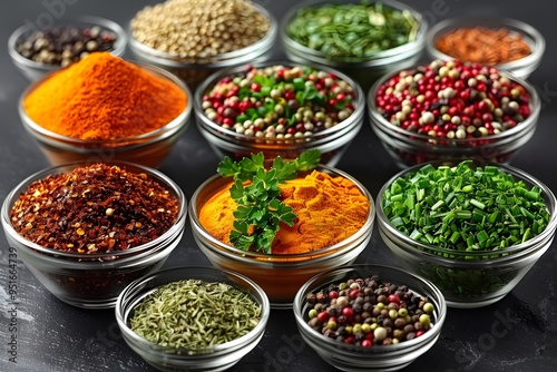 Variety of Colorful Spices and Herbs in Glass Bowls - Culinary Ingredients for Cooking and Seasoning