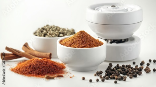 Variety of colorful spices in white ceramic cups with a spice mill on a clean background showcasing culinary ingredients and flavors