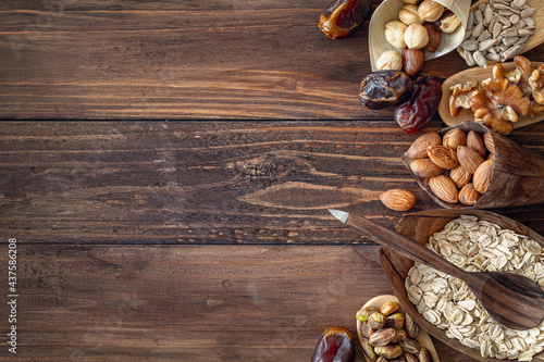 Variety of grains and mixed nuts in organic plates, on wooden brown background , top view with copy space