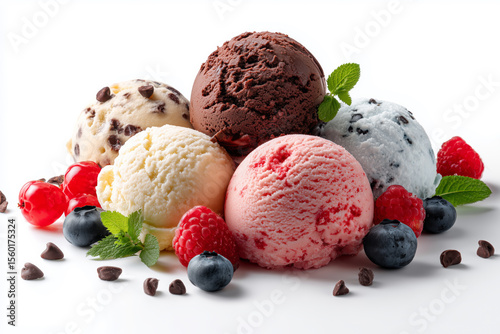 Variety of Ice Cream Scoops with Berries, Chocolate Chips and Mint on White Background