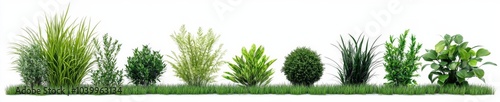 plant, shrub, row, white background, unique, shape, size, arranged, tallest, long, thin, green leaf, curved, pointed, tip, small, round, scattered, grass, light green, lush, healthy, garden, foliage, leaf, texture, nature, dwarf, pattern, background