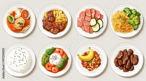 food, asian, cookery, dish, plate, meal, eatery, dinner, lunch, breakfast, vegetable, meat, protein, rice, noodle, seafood, shrimp, beef, pork meat, chicken, salad, sauce, tasty, healthy, delicious, alimentary, diet, cooking, receipe, accessing, side, dish, portion, serving, eat, nourishment, balanced, colourful, fresh, ready, nutritional
