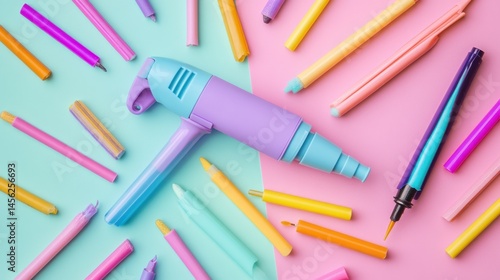 Various colored glue sticks scattered around a hot glue gun on a pastel background, perfect for a creative DIY concept.