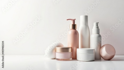 Various cosmetic containers on pristine white backdrop, containers, brush