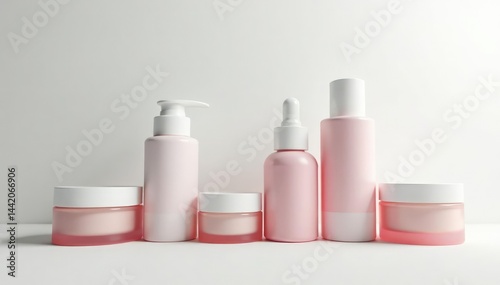 Various cosmetic containers, pristine white backdrop, modern, packaging, simple