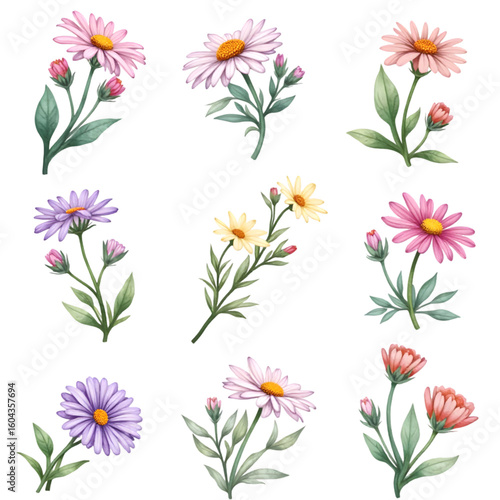 daisy, flower, blooming, bud, isolated, leaf, flora, floral, stem, blossom, pink, purple, yellow, white, botanical, botany, nature, spring, summer, illustration, drawing, art, design, element, graphic, clip art, set, collection, group, artwork, decoration, decorative