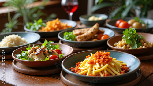 food, meal, salad, dinner, plate, vegetable, dish, table, eatery, meat, epicure, lunch, fish, tomatoes, rice, chicken, pepper, cookery, delicious, white, pork meat, fresh, seafood, healthy
