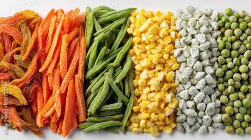 Various dried vegetables; carrots, peas, corn , macro, peas, white background
