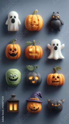 Various Halloween-themed decorations including carved pumpkins, a ghost, and a cat, displayed on a blue background for festive spirit