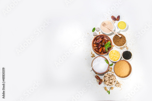 Various healthy diet replacement for sugar, natural organic sweetener concept, anti diabetes non-glycemic, sweetener. Various fruit sugar, molasses, stevia, dates, coconut and date sugar, maple syrup
