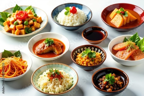 Various Japanese dishes arranged on white background, presentation, texture
