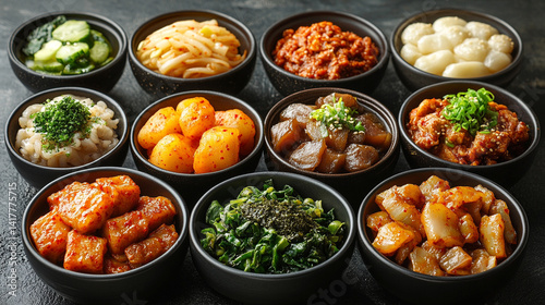 Various Korean home-style side dishes served in modern white bowls viewed from above symbolizing harmony variety and cultural richness in everyday Asian cuisine bright and inviting atmosphere