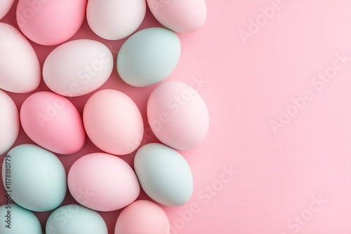 Various pastel-colored eggs in pink, blue, and white are artfully scattered on a soft pink background, ideal for spring decorations and celebrations