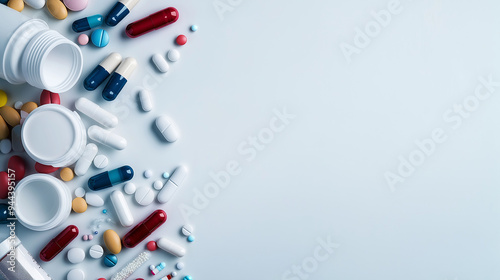 Various pharmaceutical products, such as capsules, inhalers, and topical creams, arranged on a white background with ample space for text related to medical care.
