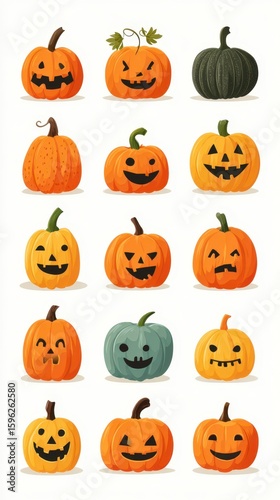 pumpkin, halloween, decoration, orange, green, expression, face, fall, harvest, autumn, seasonal, celebration, festive, skittish, traditional, squash, cheerful, design, illustration, artwork, grid, arrangement, creative, cute, character, shape, harvested, trick, treat, party, nature, vegetable, greeting, craftsmanship, collection, colourful, joyful, family, fun, hand-made, smile, artistry, decorative
