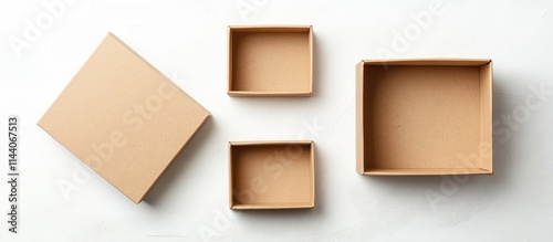 Various sizes of empty gift boxes arranged artistically on a clean white background for holiday or seasonal design concepts.