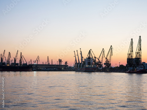 Varna, Bulgaria - July 23, 2016: View on seaport with cranes, cargo and passenger ships at sunset, Varna.