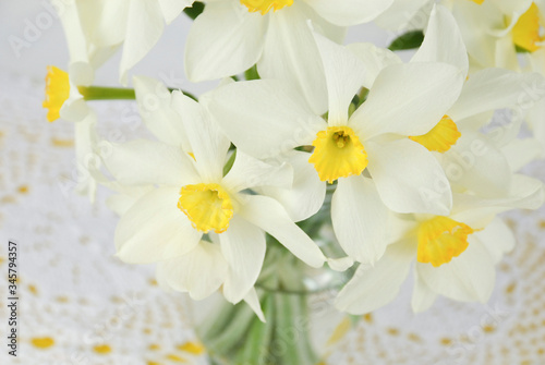 Vase of white and yellow daffodil flowers with white lace doily as background