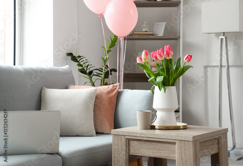 Vase with tulips and cup of tea on table in living room decorated for Women's Day