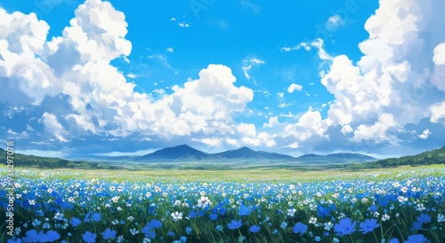 anime, wildflower, white cloud, painting, landscape, serene, expansive, nature, sky, vibrant, tranquil, artistic, illustration, beautiful, detailed, atmospheric, scenery, peaceful, visual