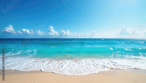 Vast expanse of deep blue ocean meeting the horizon, waves gently crashing on a sandy shore Perfect for travel, nature, and serenity themes , aqua, horizon, coastal