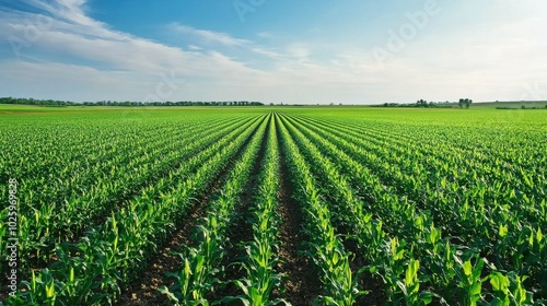 Vast green cornfield under a bright blue sky with clouds in summer