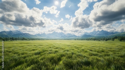 field, grass, green, mountain, sky, cloud, sun, sunny, landscape, nature, scenery, summer, day, bright, serene, peaceful, calm, tranquil, scenic, view, horizon, panorama, rural, countryside, meadow, pasture, hill, tree, vegetation, environment, wildlife, photo, image, picture, photo, background, wallpaper, desktop, mobile, tablet, wide, panoramic, hi-res, digital artwork, illustration, painting, artwork