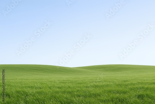 Vast Green Grass Field Under Clear Blue Sky with Gentle Hills and No Clouds.