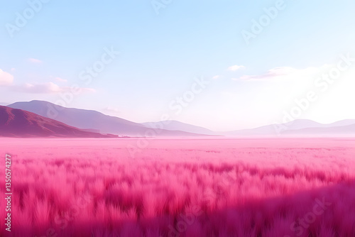 vast open landscape of Da Lat’s pink grass fields, with a gentle mountain slope and clear sky in the background